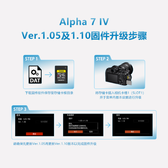 本次2个固件版本升级均需要通过下载固件软件至存储卡于机身内进行升级,且需要先完成Ver.1.05版本升级之后再进行Ver.1.10版本更新。